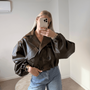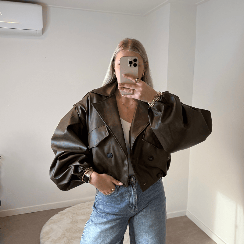 Deze trenchcoat heeft een moderne oversized look. De trenchcoat is gemaakt van leatherlook, heeft pofmouwen en grote zakken, waardoor het een stoere uitstraling heeft. De dubbele knoopsluiting geeft een speels effect.