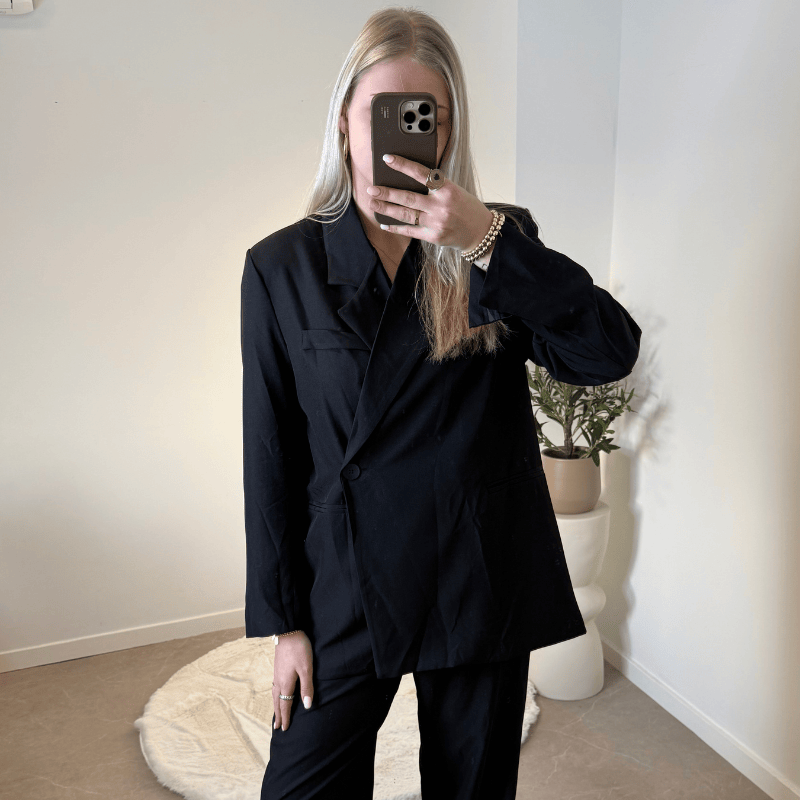 Deze zwarte blazer in combinatie met een mooi vallende pantalon koop je in 1 set! Hoe gaaf is dat!