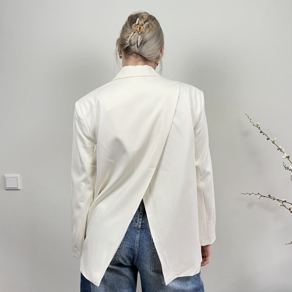Zie de gave achterkant! Wow! De asymmetrische sluiting geeft een extra detail aan deze mooie blazer. De blazer valt soepel, heeft een goede kraag en 2 zakken op de voorkant.